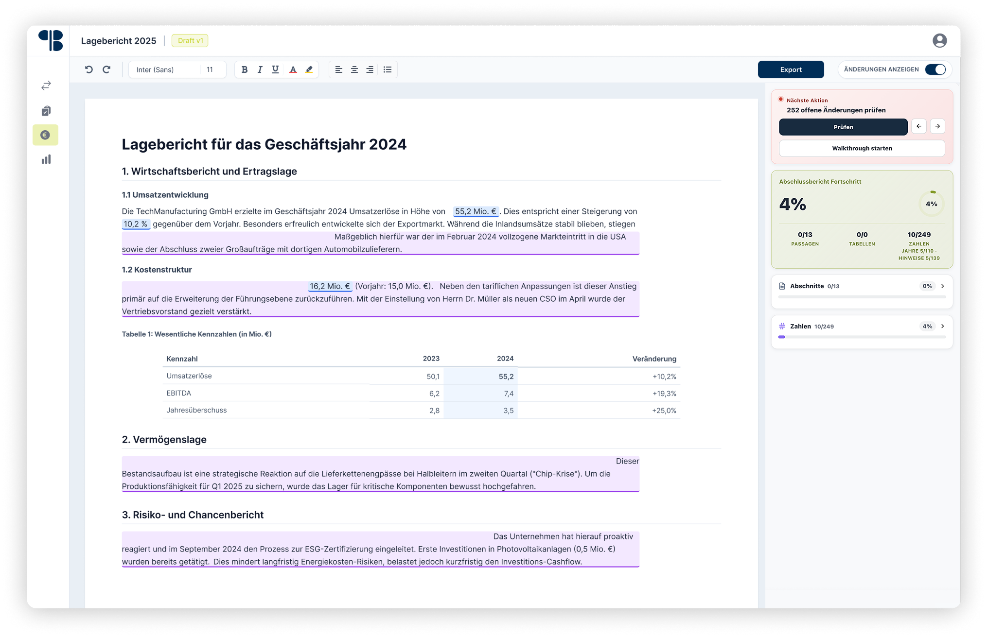 Alle generierten Analysen, Tabellen und Diagramme fließen automatisch in eine druckfertige Berichtsvorlage. Mit einem einzigen Klick können Sie Ihren vollständigen Finanzbericht exportieren und teilen.