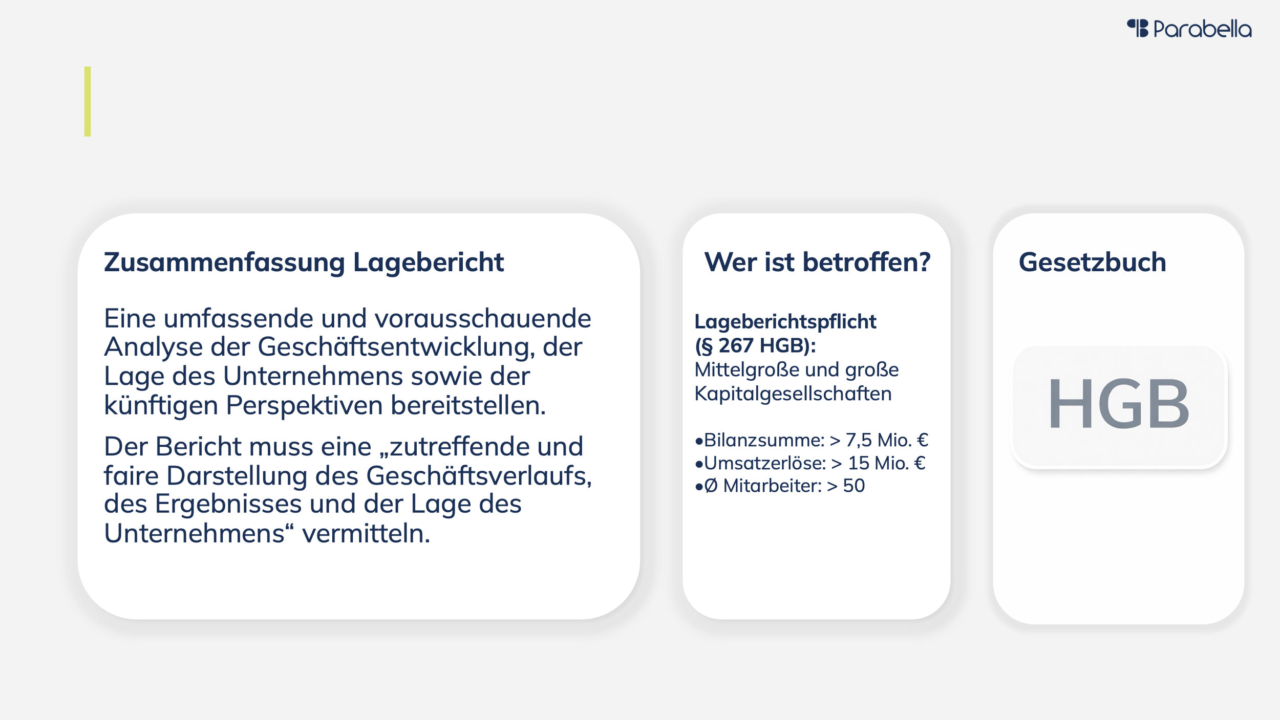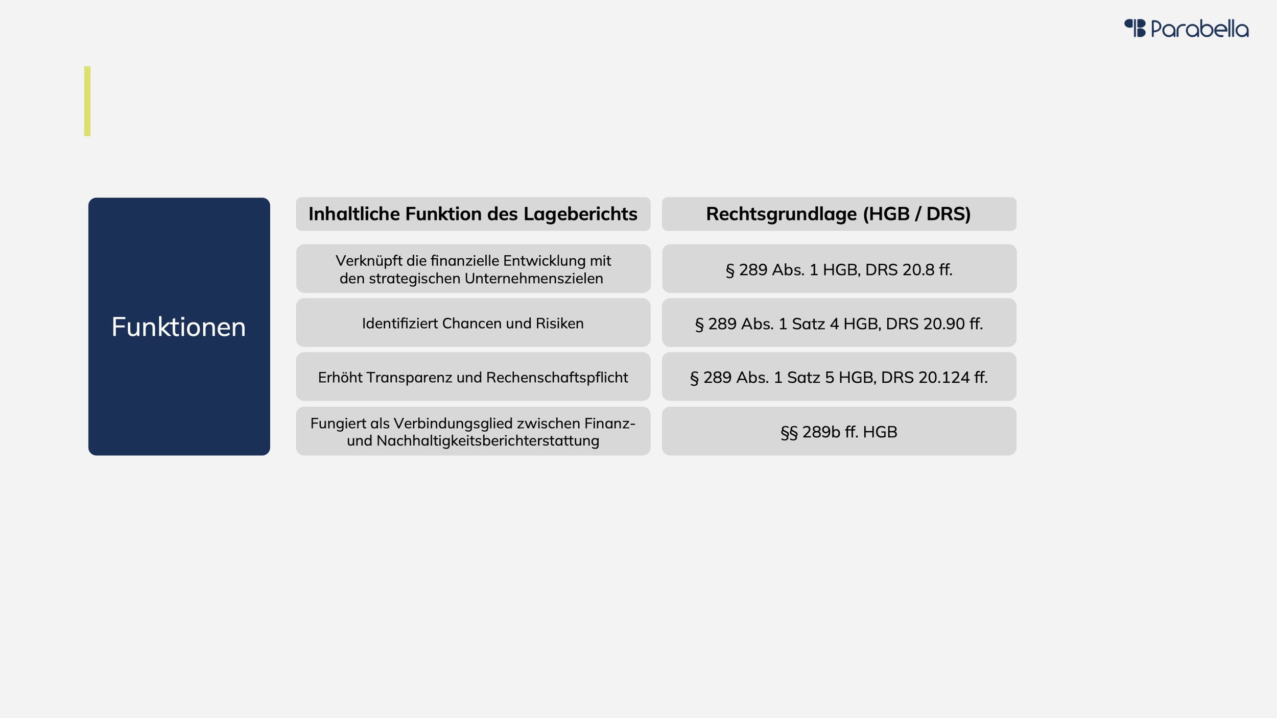 Der Lagebericht verknüpft die finanzielle Entwicklung mit den strategischen Zielen des Unternehmens und erläutert wesentliche Trends, Marktentwicklungen sowie zentrale unternehmensinterne Entscheidungen (vgl. § 289 Abs. 1 HGB, DRS 20.8 ff.). Zugleich identifiziert und bewertet er wesentliche Chancen und Risiken, die die künftige Geschäftsentwicklung beeinflussen können (vgl. § 289 Abs. 1 Satz 4 HGB, DRS 20.90 ff.). Darüber hinaus erhöht der Lagebericht Transparenz und Rechenschaftspflicht, indem eine eigenständige Beurteilung der Geschäftsleitung zur bisherigen Entwicklung sowie zur voraussichtlichen Entwicklung bereitgestellt wird (vgl. § 289 Abs. 1 Satz 5 HGB, DRS 20.124 ff.). Schließlich fungiert er als Verbindungsglied zwischen Finanz- und Nachhaltigkeitsberichterstattung – insbesondere vor dem Hintergrund der erweiterten Offenlegungspflichten nach der CSRD.