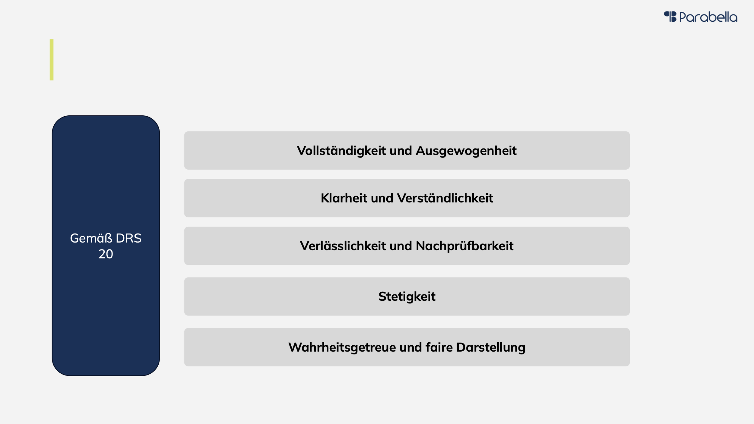 Die Berichterstattung folgt dem Grundsatz der Vollständigkeit und Ausgewogenheit und berücksichtigt alle wesentlichen Sachverhalte – sowohl positiver als auch negativer Art – um eine ausgewogene Darstellung sicherzustellen (vgl. § 289 Abs. 1 HGB, DRS 20.3). Dabei wird besonderer Wert auf Klarheit und Verständlichkeit gelegt, sodass die Inhalte übersichtlich, adressatengerecht und logisch strukturiert aufbereitet sind (vgl. DRS 20.4). Zudem ist die Verlässlichkeit und Nachprüfbarkeit gewährleistet, da sämtliche Angaben auf interner Dokumentation sowie auf prüfungsrelevanten und nachvollziehbaren Nachweisen beruhen (vgl. § 289 Abs. 1 HGB, DRS 20.5). Die Stetigkeit der Berichterstattung sorgt darüber hinaus für Vergleichbarkeit über mehrere Berichtsperioden hinweg, indem eine konsistente Darstellung und Methodik angewendet wird (vgl. DRS 20.6). Insgesamt steht eine wahrheitsgetreue und faire Darstellung im Vordergrund, die die Lage des Unternehmens in allen wesentlichen Aspekten unverzerrt und zutreffend im Sinne eines true and fair view wiedergibt (vgl. § 289 Abs. 1 HGB, DRS 20.2).