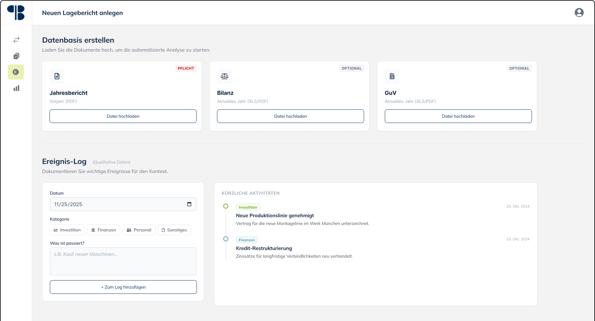 Durch die hochgeladenen Inputdaten und die Event-Logs können Sie auf einen Klick den aktuellen Lagebericht & Anhang generieren lassen.